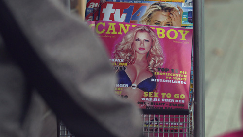 Udo bleibt fasziniert an einem Zeitungsständer mit aufreizenden Coverbildern stehen. Emmi zieht ihn genervt weiter.